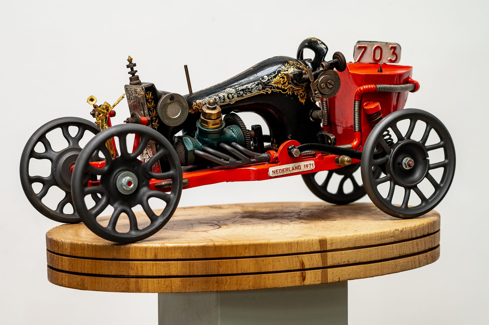 Sportwagen op basis van een Singer naaimachine.